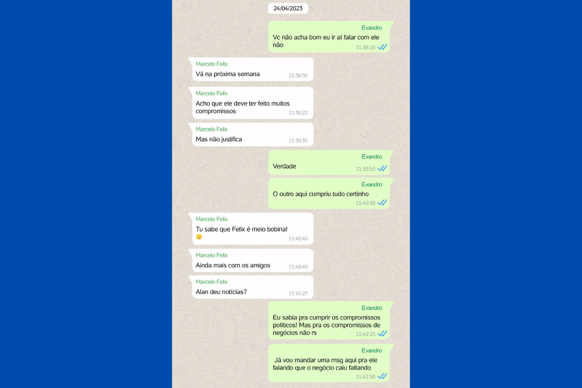 As mensagens obtidas pela PF são do assessor de Félix, Marcelo Gomes, e o empresário Evandro Baldino do Nascimento, apontado como um dos membros da suposta organização criminosa investigada na Overclean.