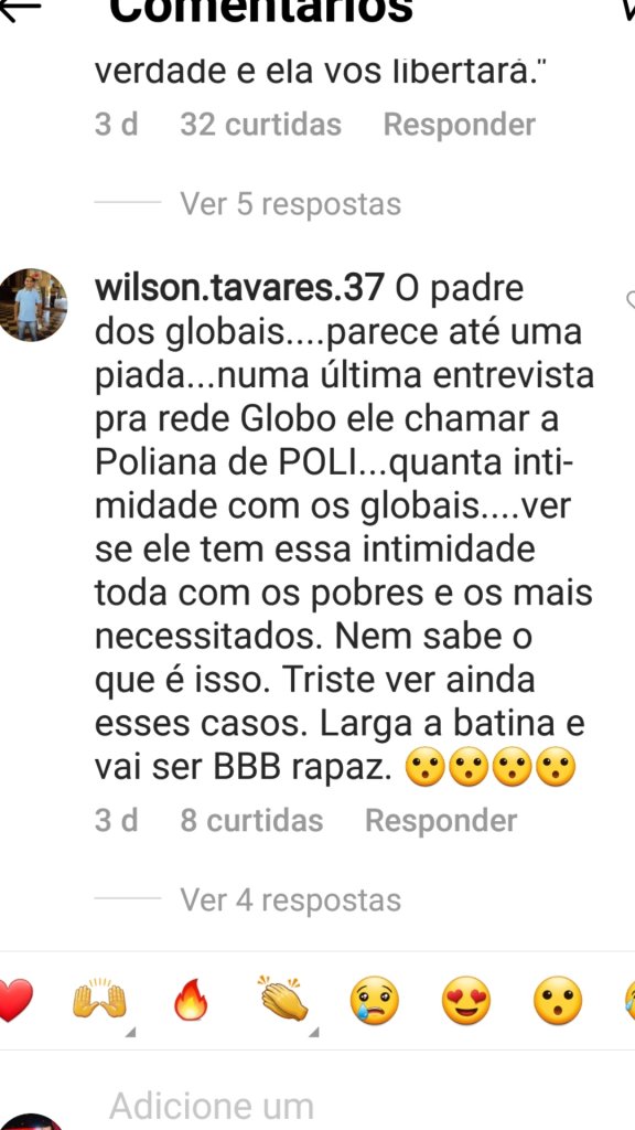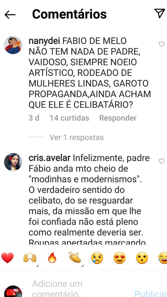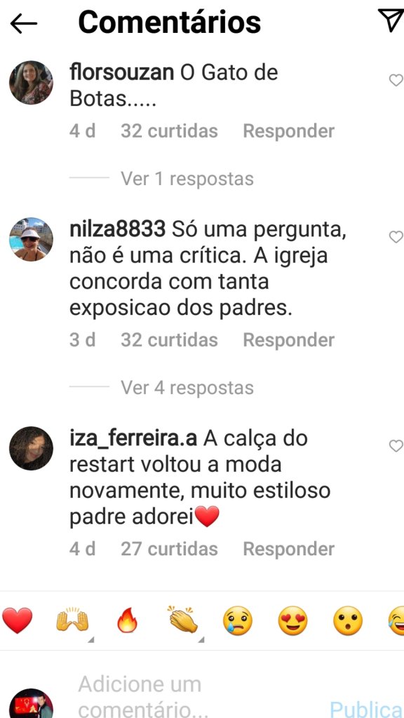 Uma foto postada há 4 dias por Padre Fábio de Melo no Instagram, continua dando o que falar. Após a atriz Elisa Lucinda dizer na postagem que não acreditava no celibato de Melo, alguns seguidores não gostaram da calça justa em que ele aparece usando uma calça justa estilo Restart. Em um dos comentários, uma seguidora diz que o religioso usa esses tipos de roupas para provocar a mulherada. Confira abaixo algumas opiniões sobre o clique.
