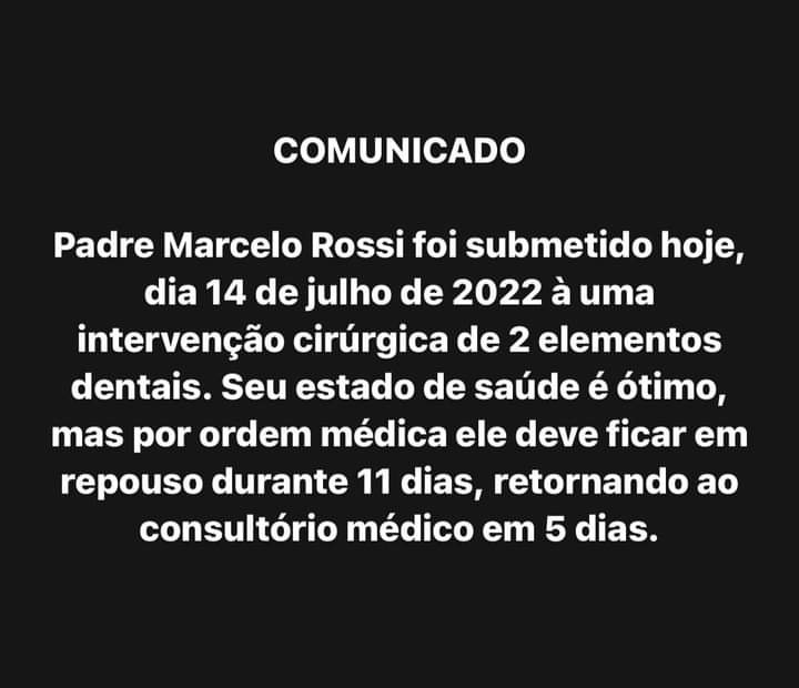 Padre Marcelo Rossi passou por uma intervenção cirúrgica de dois elementos dentais nesta quinta-feira. O religioso passa bem e ficará 11 dias de repouso.
