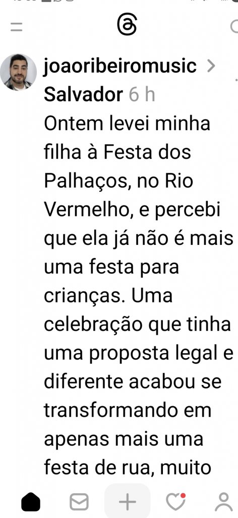 O músico João Ribeiro, fez um desabafo em uma rede social, em que critica o tradicional desfile dos Palhaços do Rio Vermelho. Segundo ele, o evento saiu do foco. Confira na íntegra: Ontem levei minha filha à Festa dos Palhaços, no Rio Vermelho, e percebi que ela já não é mais uma festa para crianças. Uma celebração que tinha uma proposta legal e diferente acabou se transformando em apenas mais uma festa de rua, muito cheia, voltada principalmente para as pessoas beberem. Não que eu seja contra isso, gosto de carnaval, mas acredito que essa não era a proposta inicial do evento. As crianças precisam ir embora às pressas para não serem engolidas pela multidão que se forma!