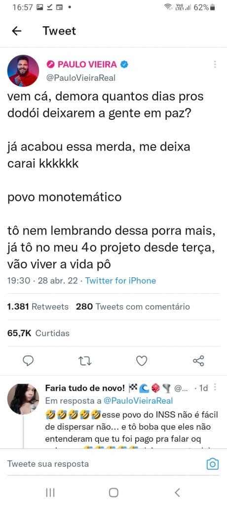 Em seu Twitter, o famoso deu uma patada nos críticos de plantão e pediu o fim dos comentários maldosos."Vem cá, demora quantos dias pros 'dodói' deixarem a gente em paz? Já acabou essa merd*, me deixa! Povo monotemático. Tô nem lembrando dessa porr* mais, já tô no meu quarto projeto desde terça. Vão viver a vida, pô", disparou.