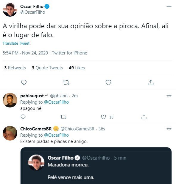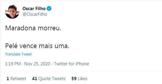 O humorista Oscar Filho fez uma piada no Twitter com a morte do ex-jogador argentino Diego Armando Maradona, que morreu após sofrer uma parada cardiorrespiratória dentro de casa nesta quarta-feira (25), e tem sido duramente criticado pelos próprios seguidores. “Pelé vence mais uma”, escreveu. A publicação foi bombardeada por críticas como, por exemplo: “Apaga isso”, “Meu Deus, cara. Que absurdo! Seu Lixo” e “Não tem compaixão”.