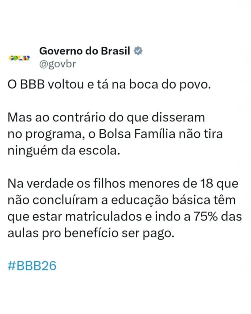 Babado! O perfil do Governo do Brasil se pronunciou no X, nesta terça-feira (13), após Solange Couto opinar sobre os benefícios cedidos à população, no #BBB26. "O 'BBB' voltou e tá na boca do povo. Mas ao contrário do que disseram no programa, o Bolsa Família não tira ninguém da escola. Na verdade os filhos menores de 18 que não concluíram a educação básica têm que estar matriculados e indo a 75% das aulas pro benefício ser pago", declarou o órgão.