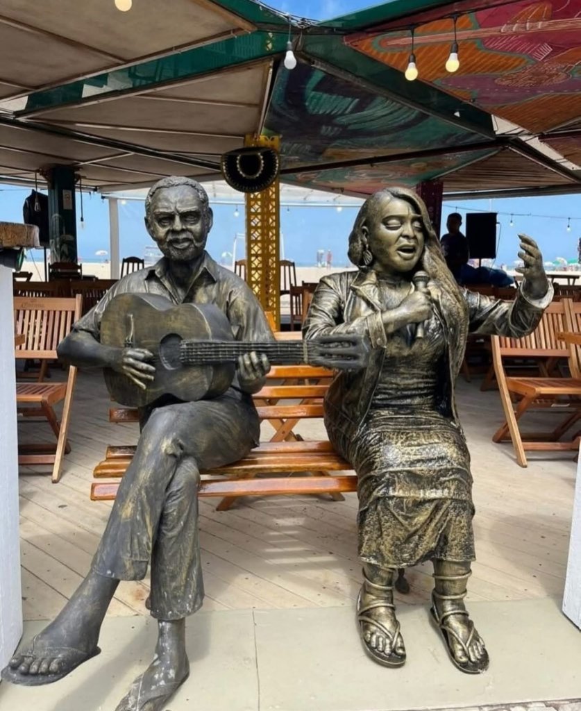 Preta Gil ganhou uma estátua na orla de Copacabana! A homenagem traz a artista cantando ao lado da estátua do pai Gilberto Gil tocando violão. Está localizada no Quiosque Areia MPB, entre os Postos 2 e 3, em frente ao Copacabana Palace.