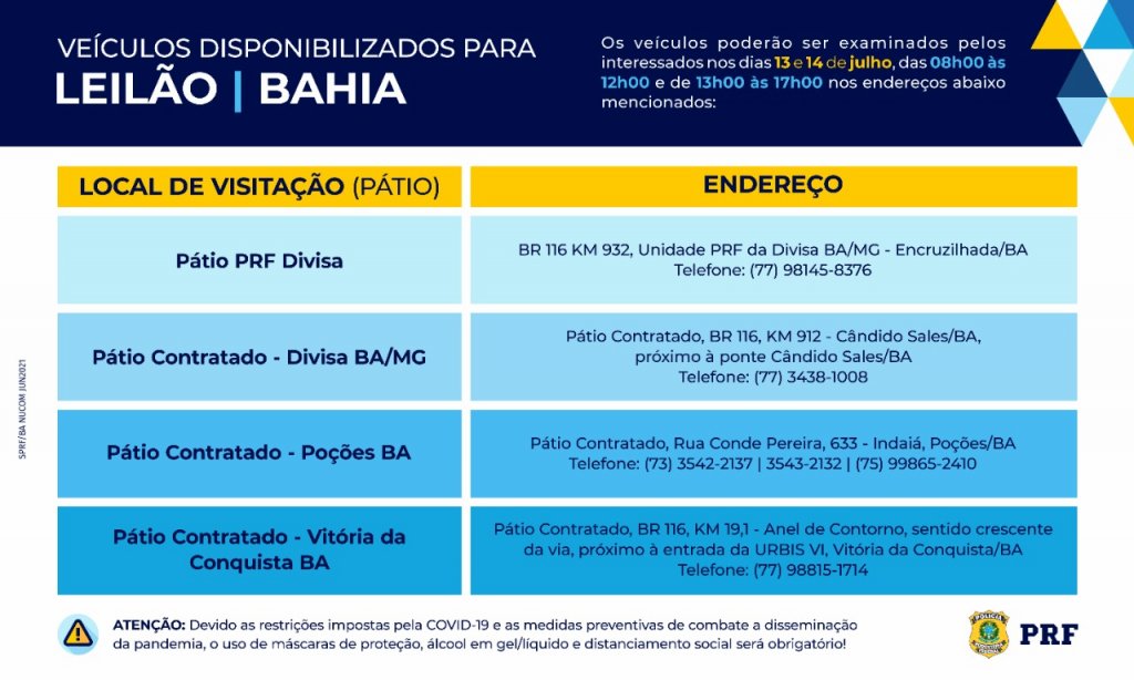 A Polícia Rodoviária Federal (PRF) na Bahia informou na última quarta-feira (30) que realizará mais um leilão de veículos a partir das 9h do dia 15 de julho, através da internet. Com lances entre R$ 50 e R$ 28.726, o leilão será encerrado às 14h do dia 16 de julho. Os veículos que vão a leilão são classificados como documentáveis, conservados ou como sucatas, que foram retidos nas unidades da PRF localizadas nas cidades de Vitória da Conquista, Poções e Divisa.