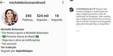 A primeira-dama Michelle Bolsonaro usou seu perfil oficial no Instagram para denunciar uma conta falsa, com mais de meio milhão de seguidores. "Pessoal, siga nossas postagens e publicações por aqui. A página já possui o selo de verificação do Instagram. Vale ressaltar que a página @michellebolsonarobrasil não é a oficial, inclusive sou bloqueada pelo administrador", escreveu a esposa de Bolsonaro.