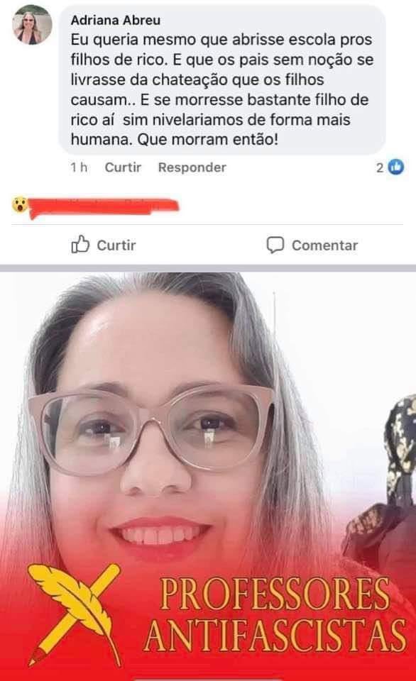 Representei no MPBA contra Adriana Abreu, professora de Letras da Universidade Estadual do Sudeste da Bahia, por seu comentário contra a reabertura das escolas, desejando a morte dos filhos de ricos. É inadmissível q uma docente, pessoa encarregada de ensinar, esteja dando aula. pic.twitter.com/fmoz2ohdKa