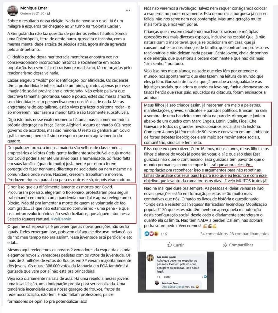 "Quando começou a Covid eu pensei: "lindo maravilhoso, vai morrer um monte de velho porque eles são machistas, racistas reacionários, conservadores, e o PT vai se eleger"", essa foi uma das declarações polêmicas emitidas pela professora municipal de Caxias do Sul (RS), Monique Emer, ao fazer menção de que nenhum candidato do PT havia sido elegido nas capitais durante as eleições municipais deste ano, ocorridas nos dias 15 e 29 de novembro.