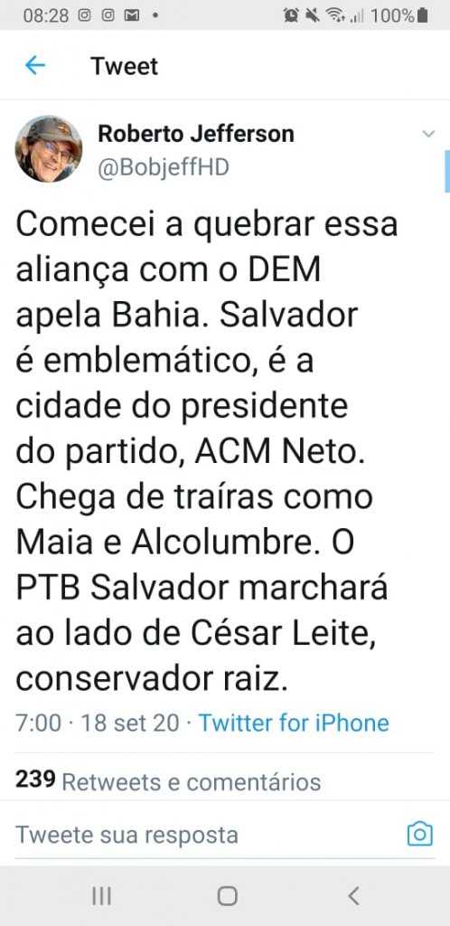 “Comecei a quebrar essa aliança com o DEM pela Bahia. Salvador é emblemática, é a cidade do presidente do partido, ACM Neto. Chega de traíras como Maia e Alcolumbre. O PTB Salvador marchará ao lado de César Leite, conservador raiz”.