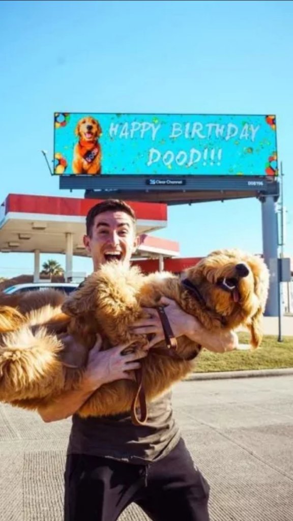 Maxx Chewning, morador do Texas, fez uma homenagem em um outdoor para comemorar o 1° aniversário do seu pet Dood.
