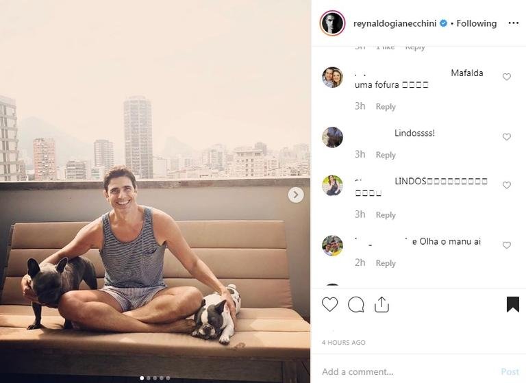 Reynaldo Gianecchini aproveitou o domingão, para se divertir com seus buldogues franceses. Ao lado de Mano e Malfada, o ator que vive o sedutor Régis, em A Dona do Pedaço, posou para a foto e compartilhou o momento na web. Os fãs adoram e encheram a publicação de comentários!