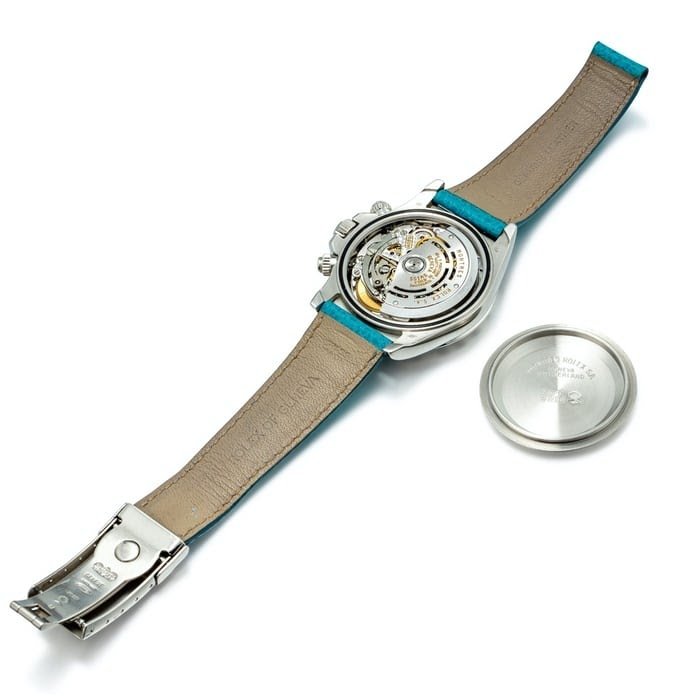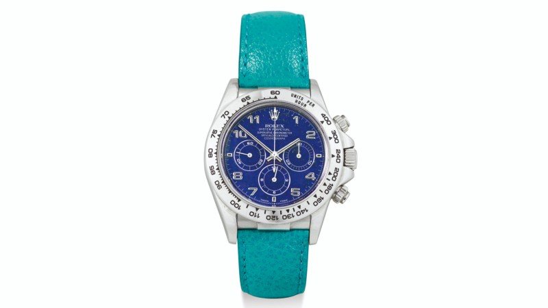 Gravado com “XIII 1998”, o item comprado por um colecionador tem mostrador em pedra lápis-lazúli e pulseira em couro turquesa brilhante com fecho dobrável de platina.