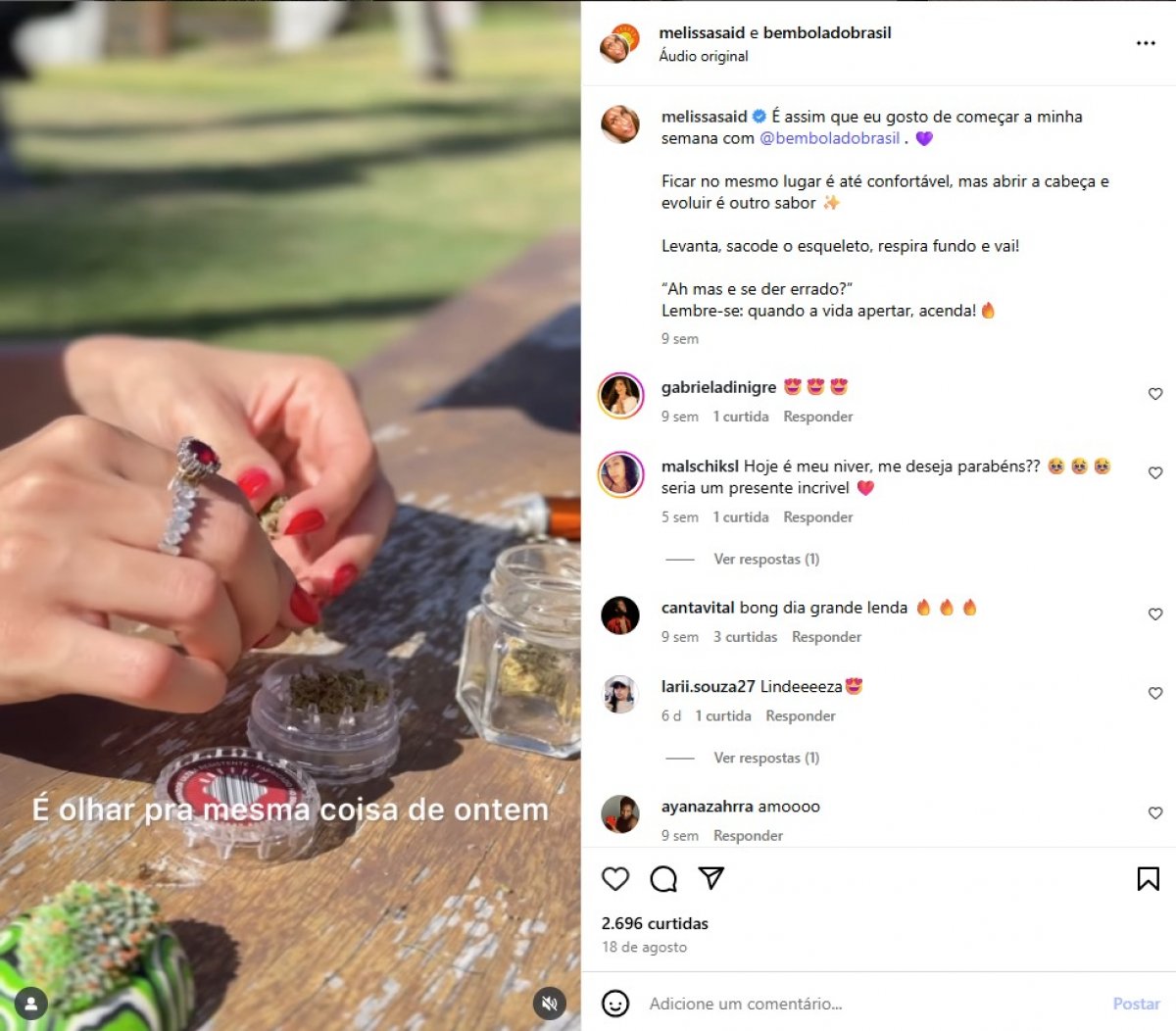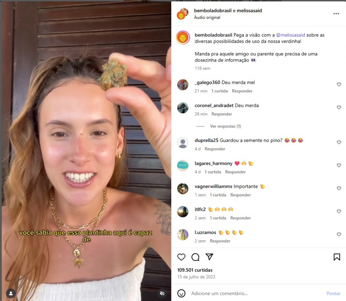 Segundo as apurações, além de fazer apologia ao uso de drogas nas redes sociais, Melissa comercializava, armazenava e distribuía maconha pela capital baiana, bem como mantinha fornecedores na Bahia e em São Paulo.