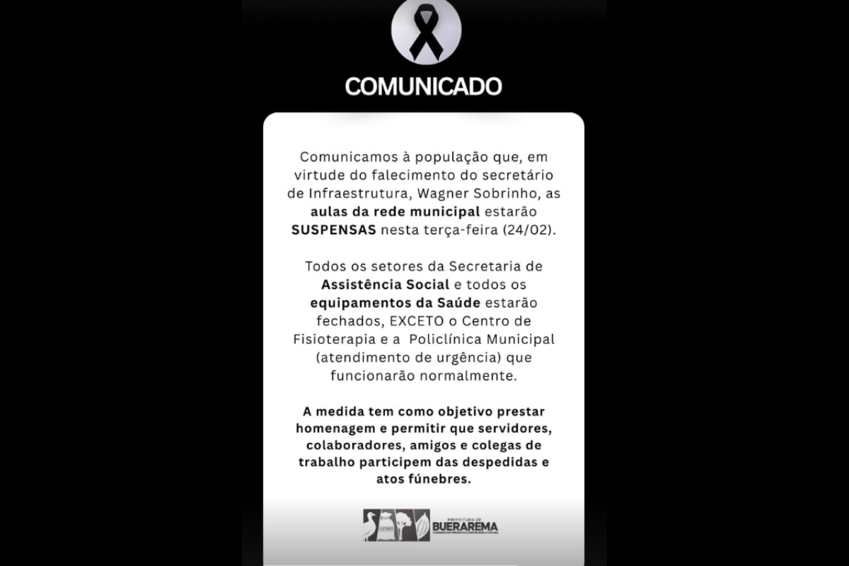 Na publicação, a gestão municipal se solidarizou com a família e os amigos, e informou a suspensão das aulas da rede municipal nesta terça-feira (24). Além disso, todos os setores da Secretaria de Assistência Social e todos os equipamentos da Saúde estarão fechados, com exceção do Centro de Fisioterapia e a Policlínica Municipal que funcionarão normalmente.