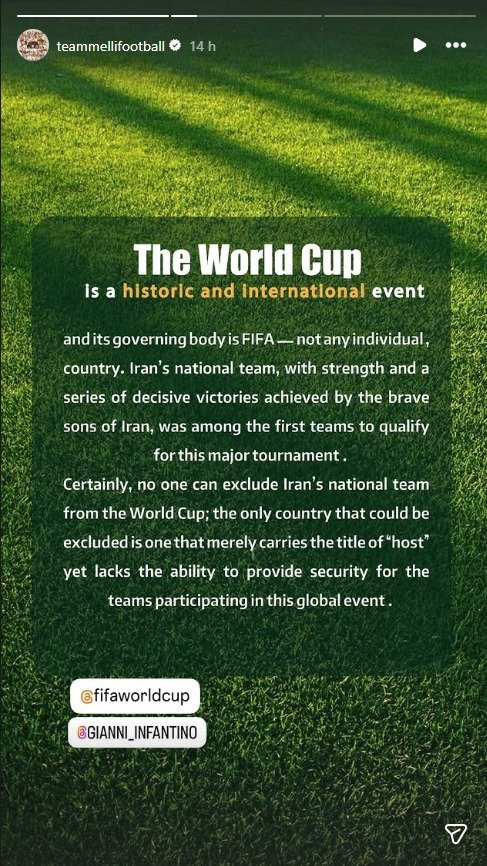 No comunicado, o perfil oficial da seleção ressaltou que a Copa do Mundo é organizada pela FIFA e que nenhuma nação ou líder político tem poder para decidir sobre a presença do Irã.
