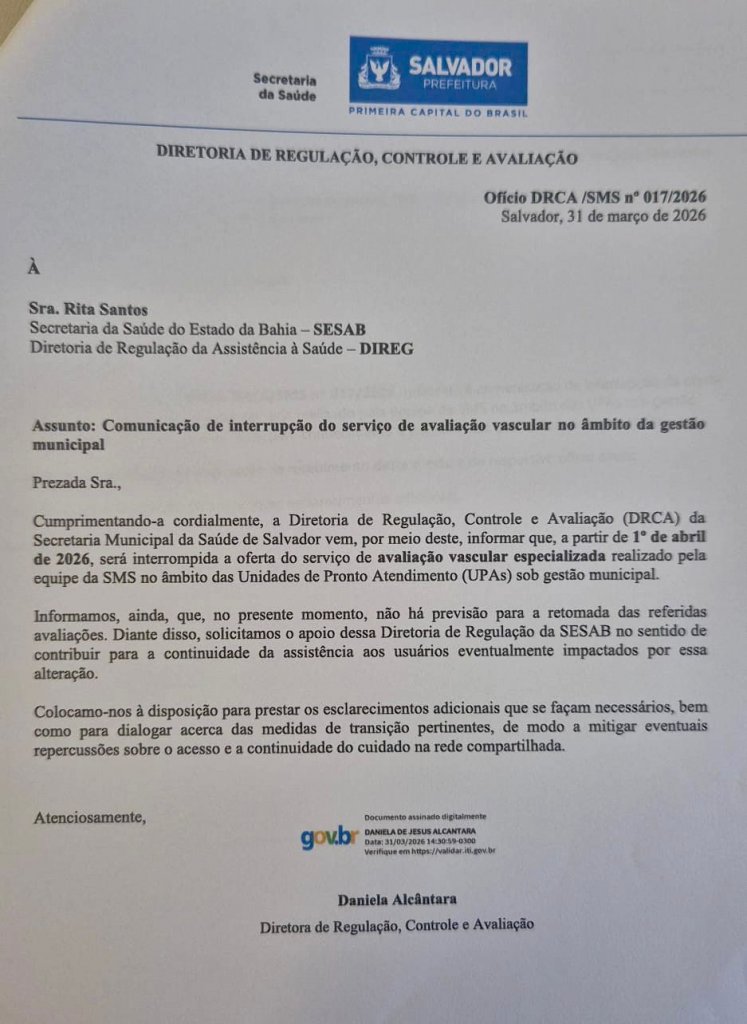 A interrupção foi informada oficialmente à Secretaria da Saúde do Estado da Bahia (Sesab) durante ofício da Diretoria de Regulação, Controle e Avaliação da Secretaria Municipal da Saúde. No documento, a Prefeitura destaca que o serviço deixaria de ser oferecido no dia seguinte e admitiu não ter previsão no reinício das atividades.