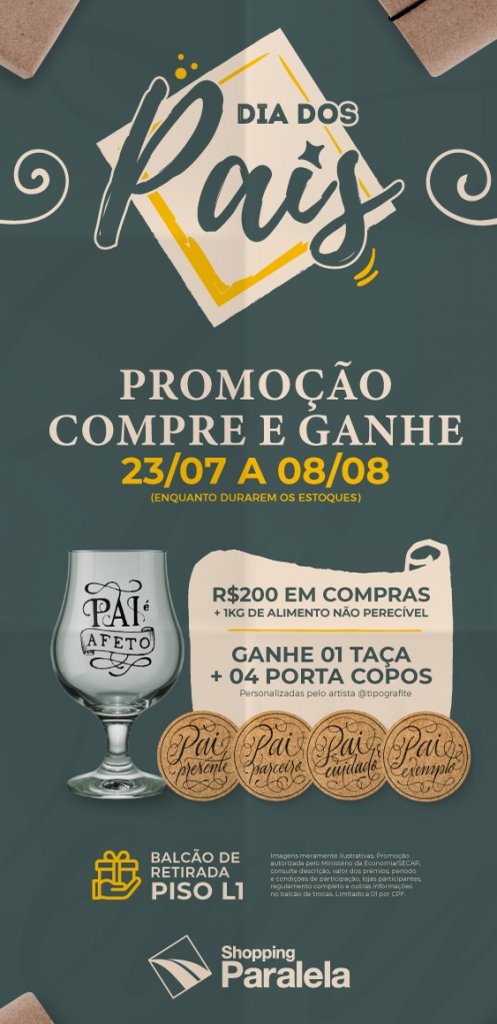 Dia dos Pais chegando e o presente para celebrar a data pode ser encontrado no Shopping Paralela. Na campanha promocional e solidária “Compre, doe e ganhe”, acima de R$ 200 em compras e mais 1kg de alimento não perecível, o cliente recebe uma taça e mais quatro porta-copos personalizados pelo artista plástico soteropolitano Raphael Ribeiro, do Estúdio Tipografite (@tipografite).
