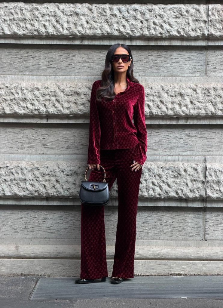 Para acompanhar a apresentação, Silvia escolheu um conjunto em veludo vinho, com camisa de botões e calça de modelagem ampla, ambas com padronagem monogramada, reforçando a identidade clássica da marca sob uma leitura contemporânea. A produção foi finalizada com bolsa estruturada preta de alça curta em bambu, sapatos de acabamento polido e óculos de sol oversized, criando um visual sofisticado e marcante.