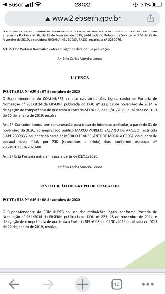 Fontes ouvidas pelo Farol da Bahia informaram que o atual gestor está ainda compondo sua equipe de transição, tendo à frente o Professor Marco Aurélio Salvino , ex-Superintendente pro tempore ( 2014 ) , médico licenciado da EBserh e Onco Hematologista