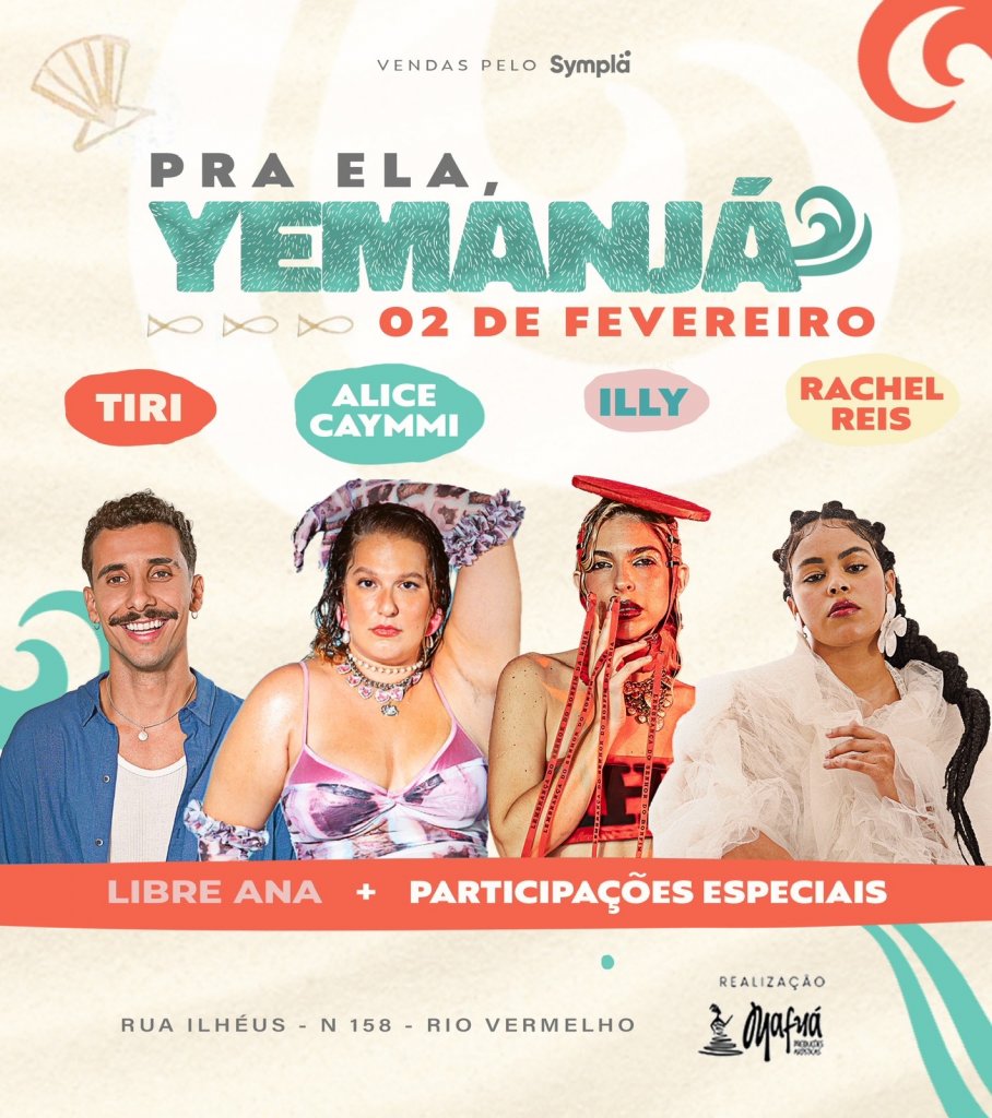 Dia 02 de Fevereiro, a partir das 15h, o Rio Vermelho, local da festa dedicada a rainha das águas salgadas, Iemanjá, receberá a festa “Pra Ela, Yemanjá”, produzida pela Mafuá Produções Artísticas e TM Produções. Comandada pelo cantor e compositor baiano Tiri (@tiridecastro), esta primeira edição do evento recebe as lindas presenças de artistas: Dj Libre Ana, e as cantoras Alice Caymmi, Illy e Rachel Reis. Os ingressos já estão disponíveis na plataforma Sympla através do link: https://www.sympla.com.br/evento/para-ela-yemanja/1855602