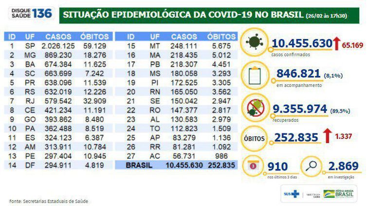 Nas últimas 24 horas, foram registradas 1.337 novos óbitos e 65.169 casos, totalizando 10.455.630 infectados desde o início da pandemia.