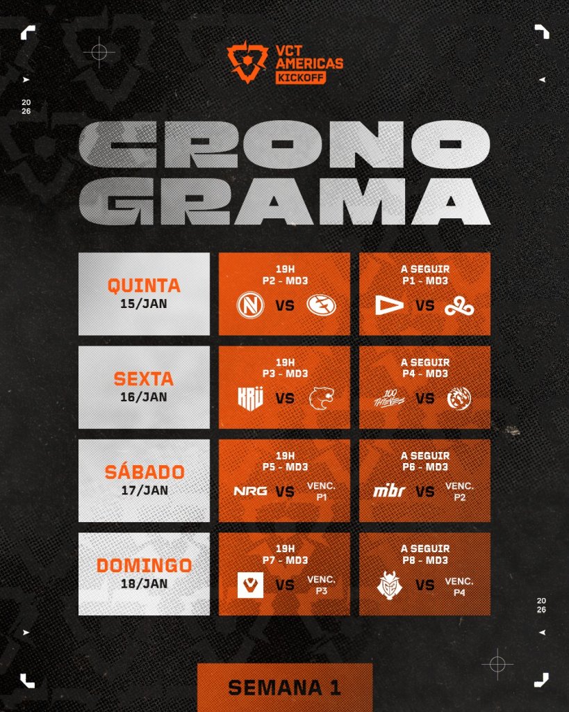 A primeira etapa do Valorant Champions Tour 2026 (VCT AMÉRICAS) começa na próxima quinta-feira (15), e contará com estreia de equipe brasileira logo no primeiro dia. Com ausência da fase de grupos, a edição deste ano conta com um formato exclusivo de tripla eliminação.