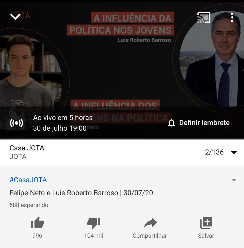 Está marcado para esta quinta-feira (30), um debate entre o youtuber e o ministro do STF, Luís Roberto Barroso, sobre "A influência da política nos jovens" e "A influência dos jovens na política". No entanto, a live que tem horário marcado para iniciar às 18h, já sofre rejeição do público desde essa quarta-feira (29), quando registrou 21 mil descurtidas até as 22h30.