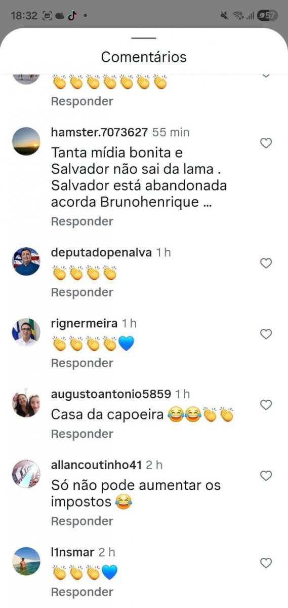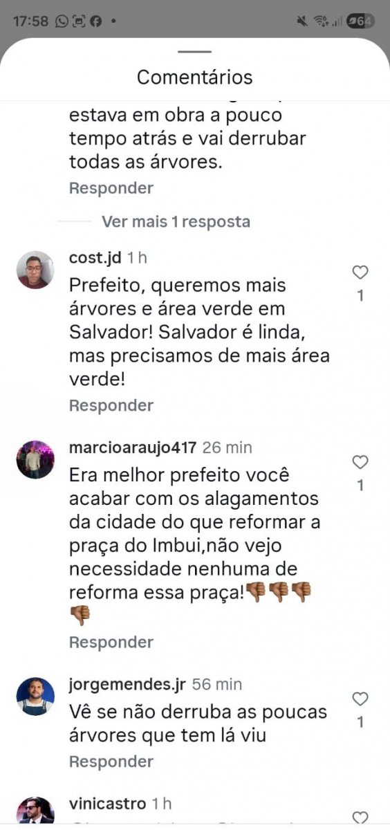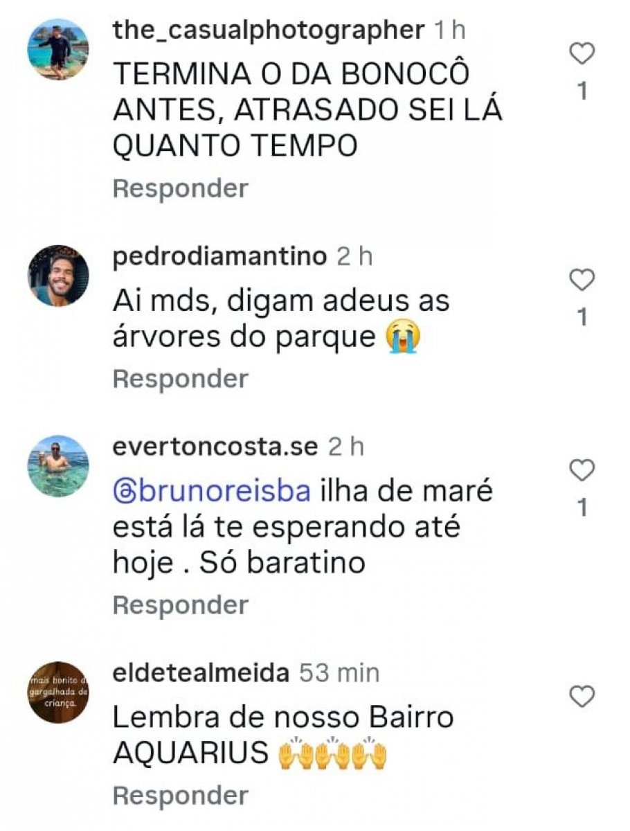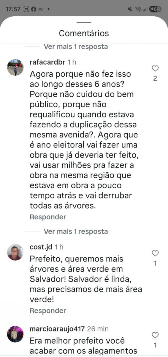Outra pessoa faz um apelo para que o prefeito não derrube árvores no local. "Vê se não derruba as poucas árvores que tem lá", diz. Ainda no tema de meio ambiente, outro internauta afirma que a cidade precisa de mais árvores. "Prefeito, queremos mais árvores e área verde em Salvador! Salvador é linda, mas precisamos de mais área verde", escreve.