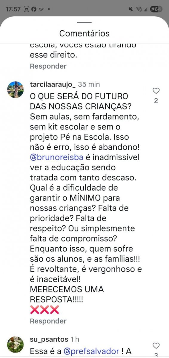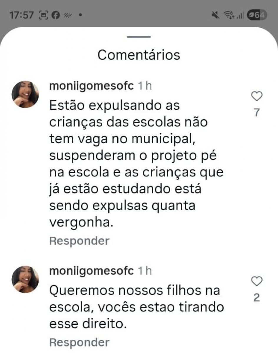 Um comentário diz: "Estão expulsando as crianças das escolas, não tem vaga no municipal, suspenderam o projeto pé na escola e as crianças que já estão estudando estão sendo expulsas. Quanta vergonha".