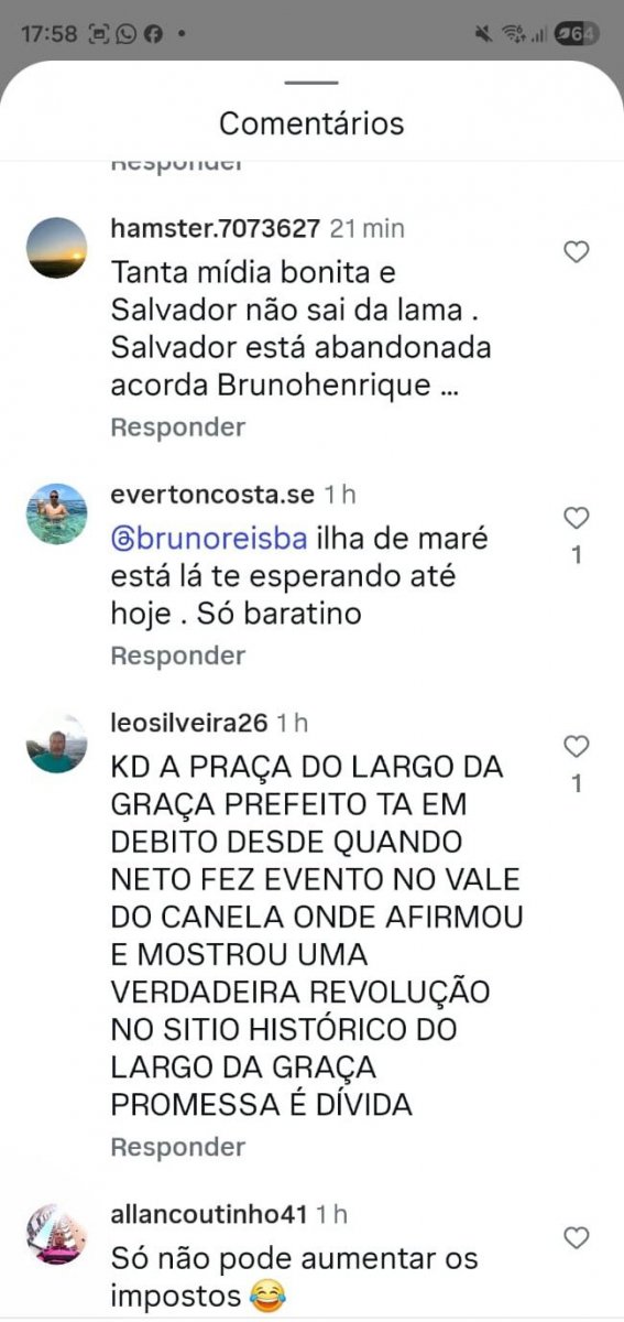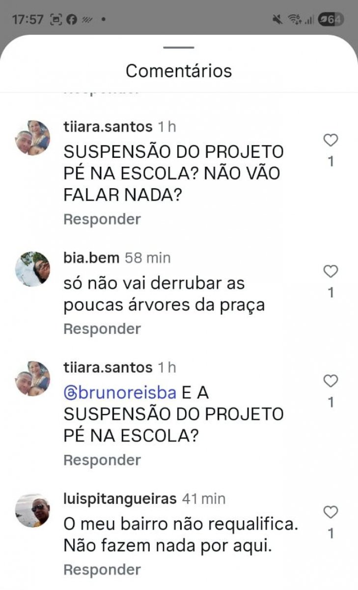 O prefeito de Salvador, Bruno Reis (União Brasil) anunciou nas redes sociais um projeto de requalificação de um parque no Imbuí. No entanto, nos comentários da publicação, foi alvo de inúmeras críticas à sua administração.