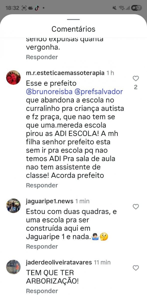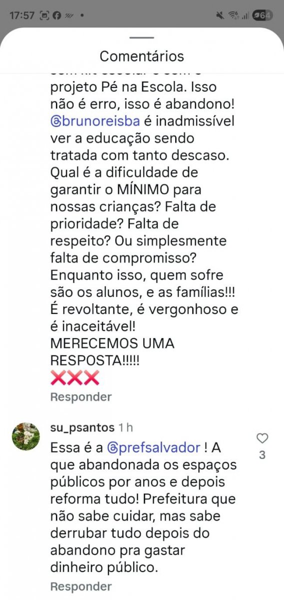No setor da educação, outro internauta aponta a promessa de construção da unidade educacional destinada ao atendimento especializado de crianças com Transtorno do Espectro Autista (TEA), localizada no bairro do Stiep (região da Boca do Rio conhecida como Curralinho), em Salvador que não teve a obra concluída, como já exposto pelo Farol da Bahia. "Esse é o prefeito @brunoreisba @prefsalvador que abandona a escola no curralinho pra criança autista e faz praça, que não tem se quer uma merenda escola! A minha filha, senhor prefeito está sem ir pra escola porque não temos ADI pra sala de aula não tem assistente de classe! Acorda prefeito", relata.