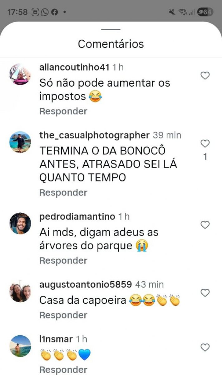 "Agora porque não fez isso ao longo desses 6 anos? Porque não cuidou do bem público? Agora que é ano eleitoral vai fazer uma obra que já deveria ter feito, vai usar milhões pra fazer a obra na mesma região que estava em obra há pouco tempo atrás e vai derrubar todas as árvores.", escreve outra pessoa.