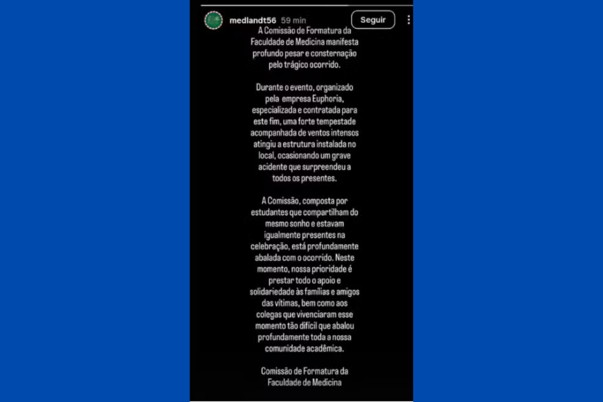 Já a Comissão de Formatura da Faculdade de Medicina e a empresa Euphoria -empresa especializada e contratada para a organização do evento explicaram que "uma forte tempestade acompanhada de ventos intensos atingiu a estrutura instalada no local, ocasionando um grave acidente que surpreendeu a todos os presentes".
