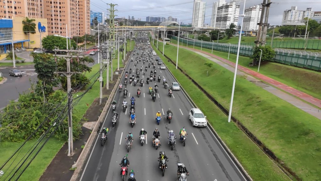 O grupo de apoiadores pilotam nas ruas de Salvador, com saída da Arena Fonte Nova, local em que foi a concentração, em direção ao Centro de Convenções da capital baiana, na Avenida Octávio Mangabeira.
