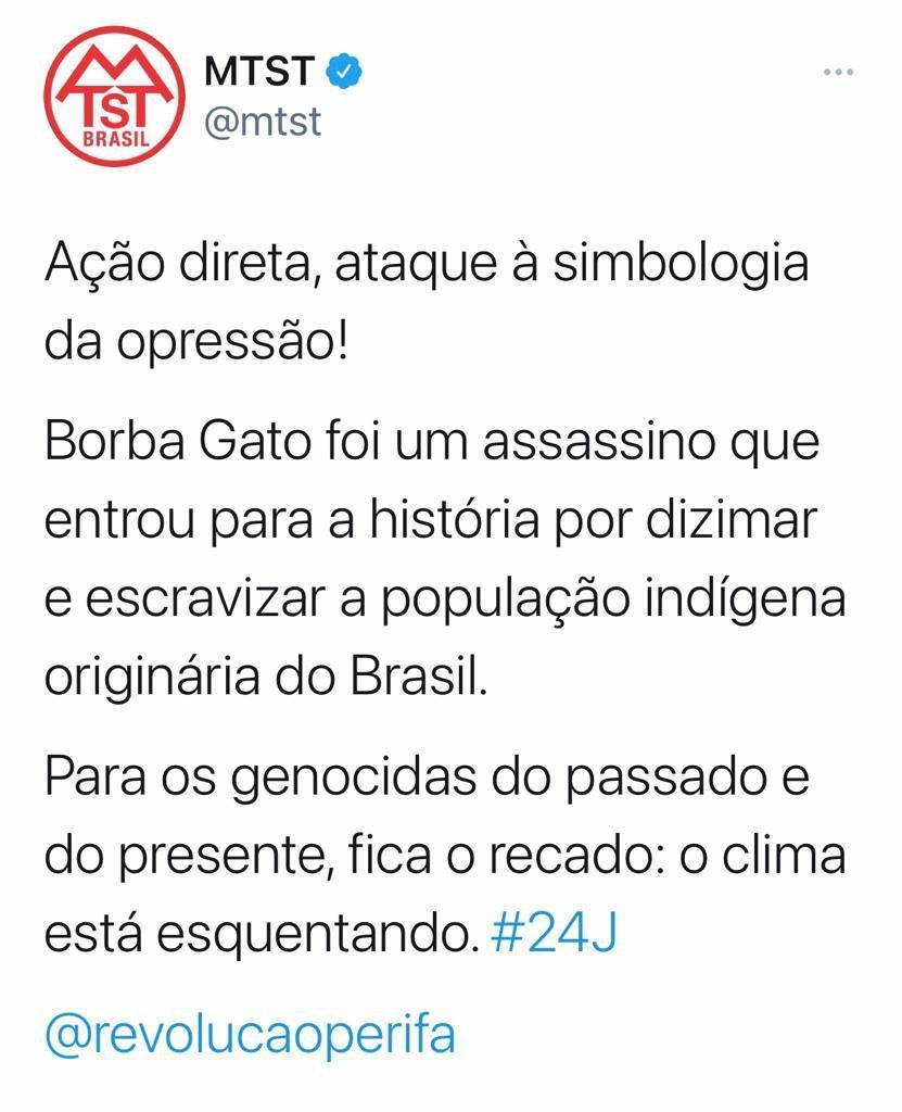 Em tweet, o Movimento dos Trabalhadores Sem-Teto, afirmou: "Ação direta, ataque à simbologia da opressão!"