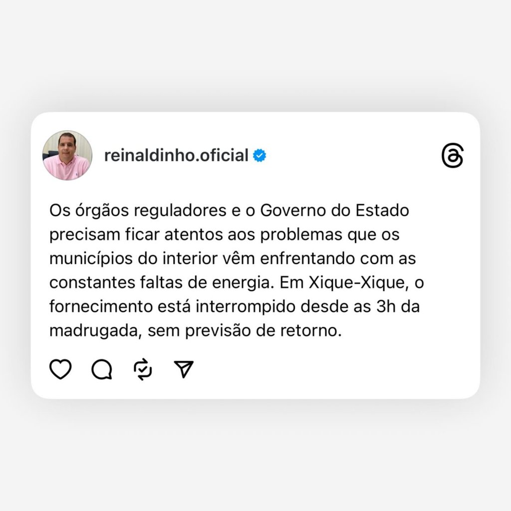 Em uma publicação nas redes, o ex-prefeito do município, Reinaldo Braga Filho, afirmou que o abastecimento de energia na cidade tem problemas recorrentes.  Ele também cobrou atenção do Governo do Estado à situação.