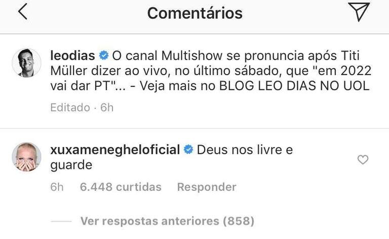Ontem, Xuxa Meneghel agitou a web por causa de um comentário que deixou em uma publicação. O bafafá começou quando Leo Dias publicou em seu Instagram contando que o canal Multishow havia se pronunciado após a repórter Titi Muller falar que "em 2022 vai dar PT" durante uma transmissão ao vivo.