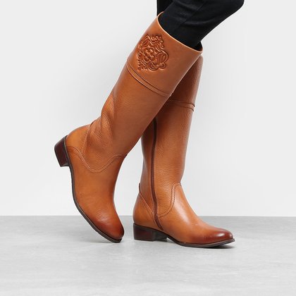 3- Bota montaria: A bota de cano alto e salto baixo ganha esse nome graças à sua inspiração nos calçados usados para cavalgar. A bota montaria é ultra confortável e atemporal. Use com vestidos, meia-calça ou calças jeans.