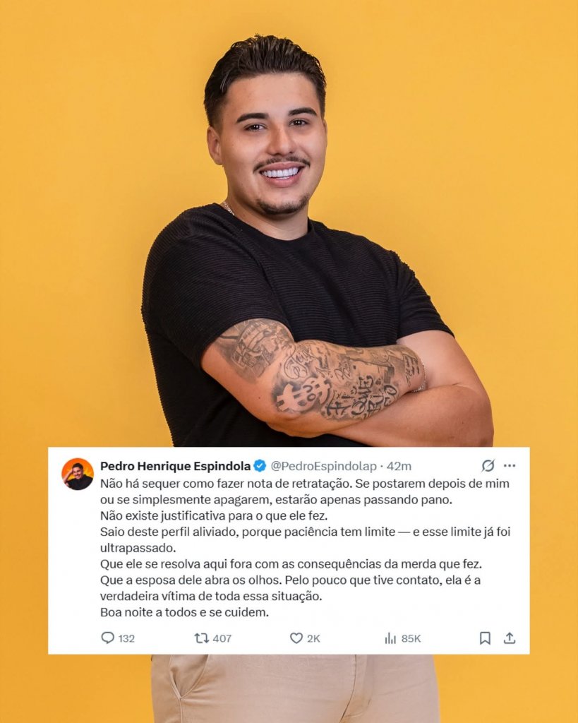 “Não há sequer como fazer nota de retratação. Se postarem depois de mim ou se simplesmente apagarem, estarão apenas passando pano. Não existe justificativa para o que ele fez. Saio deste perfil aliviado, porque paciência tem limite — e esse limite já foi ultrapassado. Que ele se resolva aqui fora com as consequências da merda que fez. Que a esposa dele abra os olhos. Pelo pouco que tive contato, ela é a verdadeira vítima de toda essa situação. Boa noite a todos e se cuidem”, diz o comunicado.