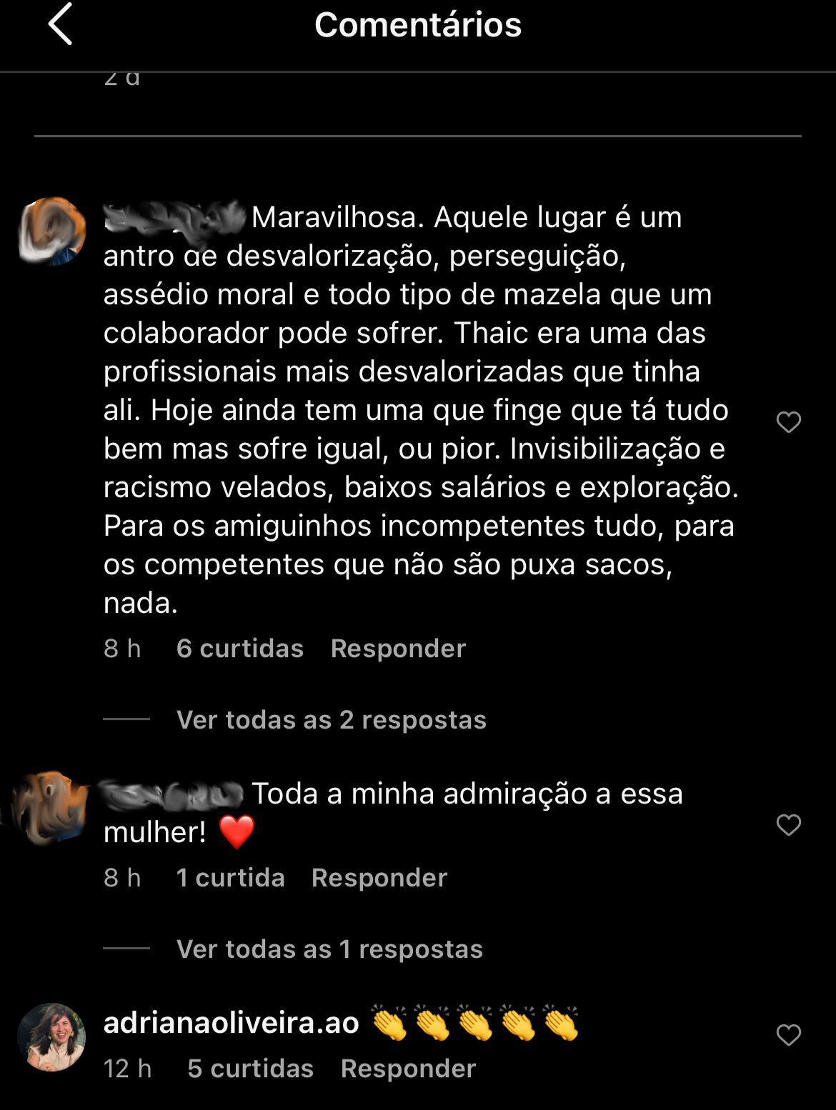 Nos bastidores, circula a informação de que a saída estaria relacionada a uma suposta violação do código de conduta da emissora. Em uma publicação nas redes sociais, uma ex-produtora demitida recentemente fez críticas à empresa, afirmando que havia “práticas de invisibilização e racismo velado” no ambiente de trabalho. Adriana teria comentado a postagem com o emoji de palmas, gesto interpretado como apoio às declarações.