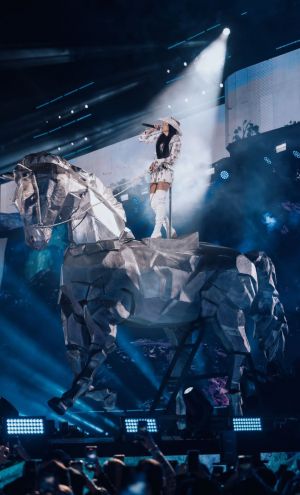 Finalizando em grande estilo, vestida toda de branco, Ana Castela deu o nome e em cima da uma escultura de um cavalo feito de tubo de aço de carbono com acabamento em isopor e fibra de vidro medindo 5 metros, idealizado pela Mode Criative, ela causou impacto ao som de "Tô Voltando".