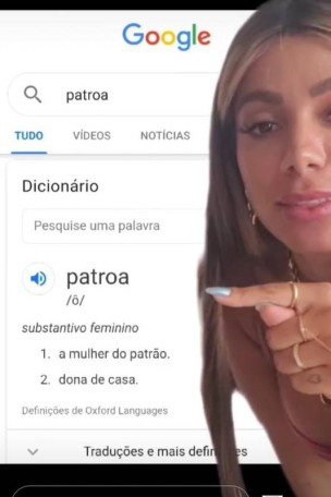 Ontem , Anitta usou as redes sociais para mostrar o descontentamento com a definição dada pelo google da palavra "patroa", um de seus apelidos. Como resultado da busca, surgem os termos "mulher do patrão" e "dona de casa", o que deixou a cantora irritada. Antes de fazer a crítica, Anitta pediu para que os fãs dessem uma olhada nos seus stories. Primeiro, ela mostrou a definição da palavra no masculino. "Patrão: proprietário ou chefe de um estabelecimento privado comercial, industrial, agrícola ou de serviços, em relação aos seus subordinados; empregador". Depois de mostrar a palavra no masculino, Anitta revelou como o dicionário do Google define o que é patroa: "Que po.. é essa, mano? Vá para a ponte que pariu. Porque patroa é a mesma coisa que está escrito lá no patrão. Dona e proprietária do cacete que eu quiser. Mano do céu, inacreditável. Não tô acreditando que isso está no nosso dicionário".