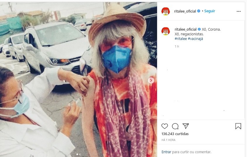 Em uma rede social, Rita publicou o momento em que recebeu o imunizante e escreveu na legenda: "Xô, Corona. Xô, negacionistas". [veja abaixo]