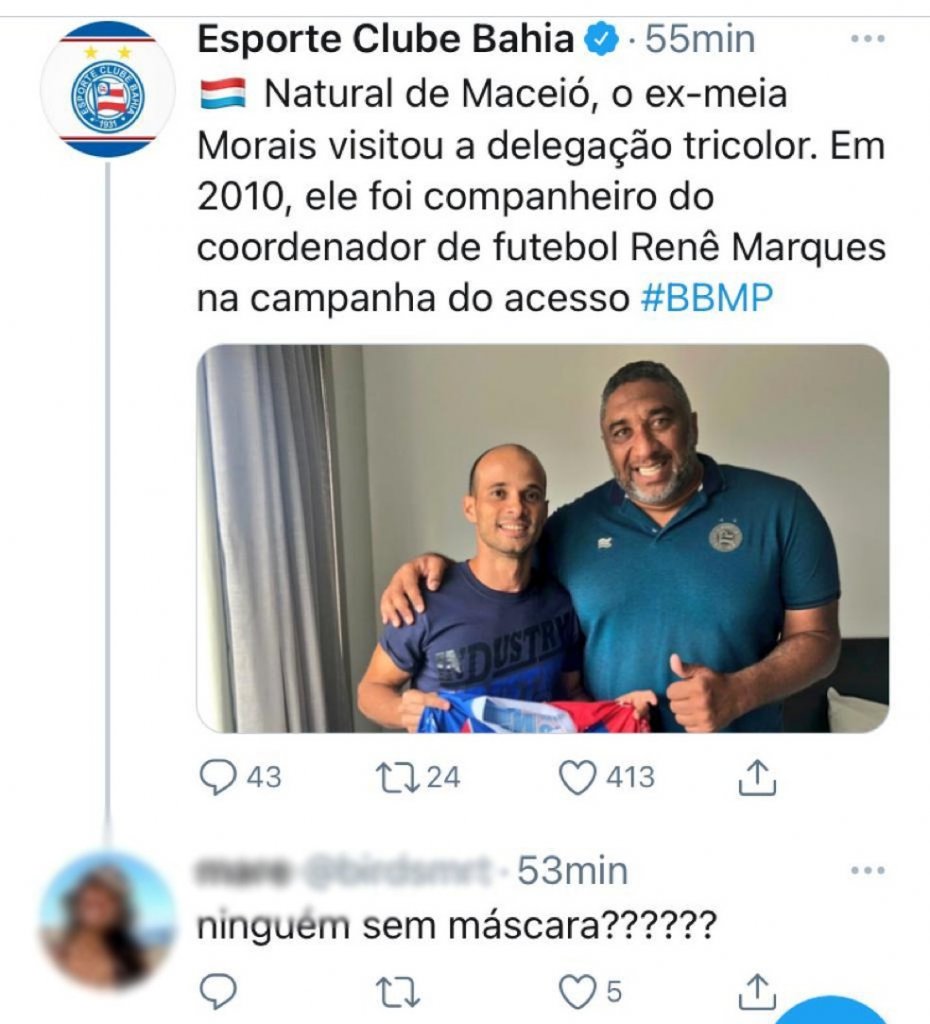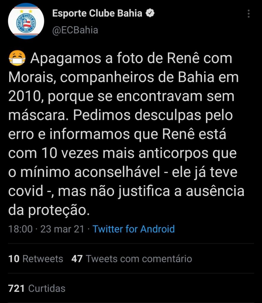 Após receberem inúmeras críticas, o Bahia apagou a publicação da redes sociais e pediu desculpas pelo erro. Ao argumentar, informaram que "Renê está com 10 vezes mais anticorpos que o mínimo aconselhável - ele já teve covid-, mas não justifica a ausência da proteção".