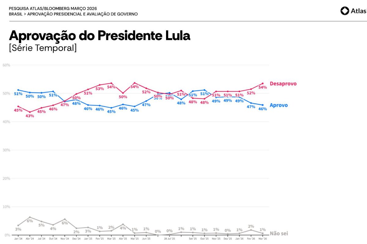 A aprovação do presidente Luiz Inácio Lula da silva (PT) sofreu uma leve queda em fevereiro. 51,5% dos brasileiros desaprovam a atuação de Lula, enquanto 46,6% aprovam. Os dados são da pesquisa AtlasIntel/Bloomberg divulgada nesta quarta-feira (25).