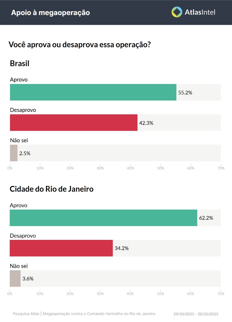 A maioria dos brasileiros (55,2%) aprova a megaoperação que resultou em mais de 121 mortes nos complexos do Alemão e da Penha, zona norte do Rio de Janeiro, na última terça-feira (28). A aprovação também existe entre a maior parte dos cariocas (62%).