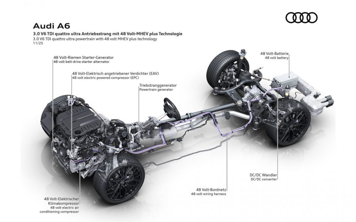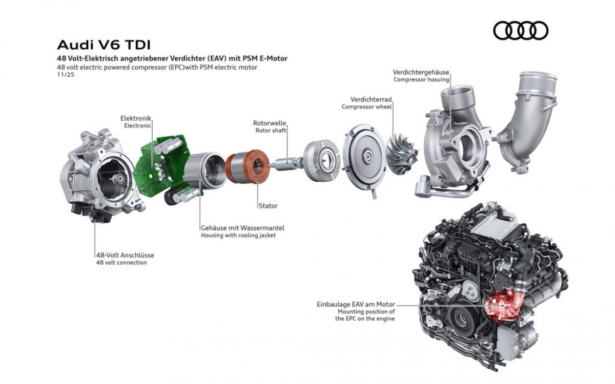 A Audi anunciou uma nova versão do motor V6 3.0 TDI para os modelos Audi Q5 e Audi A6 na Europa — agora equipada com tecnologia híbrida leve (MHEV plus) e compressor elétrico. O conjunto oferece 299 cv (220 kW) e 580 Nm de torque, com apoio elétrico de até 24 cv e 230 Nm, melhorando respostas em baixas rotações e reduzindo o “turbo lag”.  Ainda não se pode afirmar que o Q5 e A6 serão lançados no Brasil.