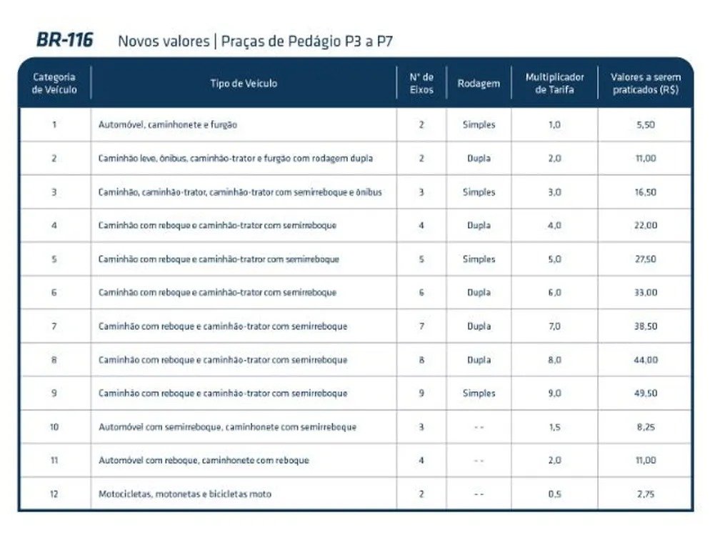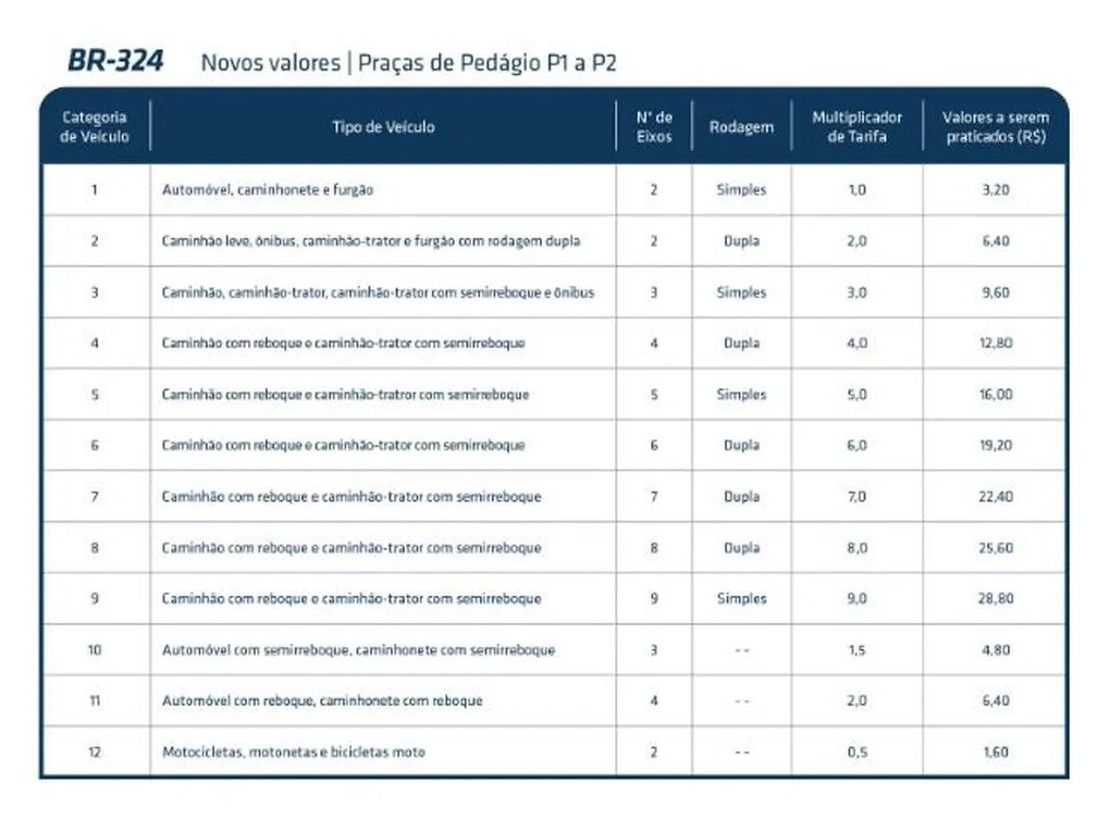 O reajuste foi aprovado pela Agência Nacional de Transportes Terrestres (ANTT). A cobrança para automóveis passa de R$ 2,90 para R$ 3,20 na BR-324 e de R$ 5,10 para R$ 5,50 na BR-116. Veja abaixo as novas tarifas: