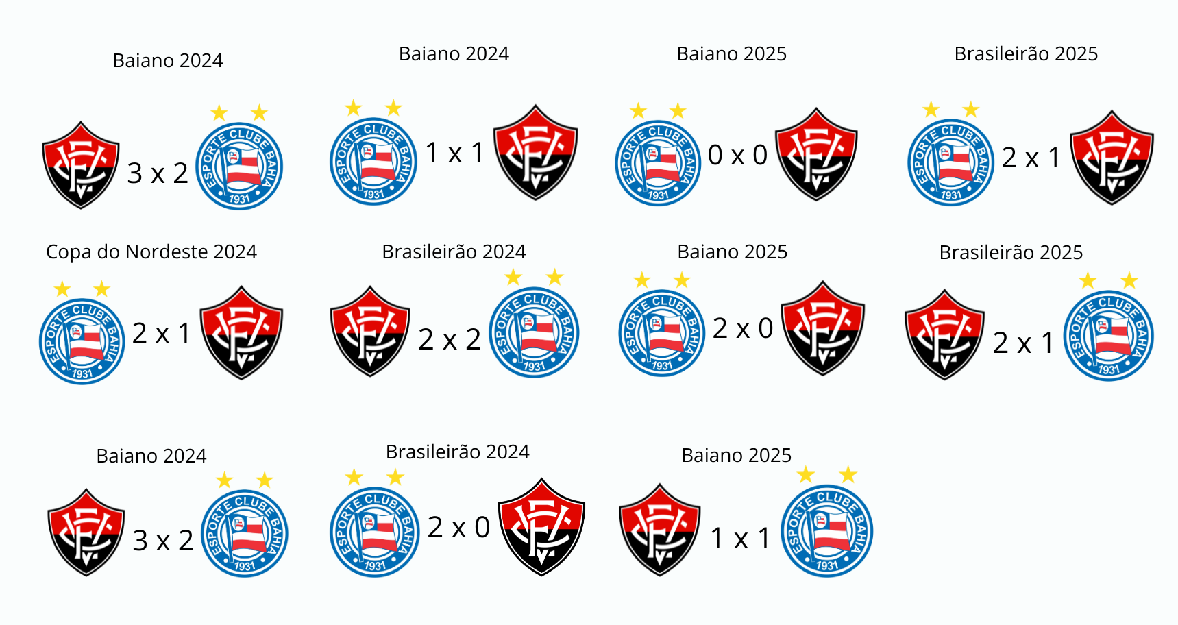 O retrospecto de Rogério Ceni, no Bahia, contra o Vitória também é equilibrado. Ao todo, o treinador enfrentou o Leão da Barra em 11 partidas, com quatro triunfos, quatro empates e três derrotas, números que refletem o equilíbrio histórico do maior clássico do futebol baiano.
