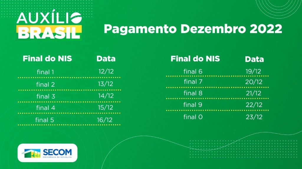 Em dezembro, o Auxílio Brasil atingiu um novo recorde de famílias atendidas em todo o país. No total, 21,6 milhões de famílias serão contempladas. O valor médio do benefício a ser pago nacionalmente é de R$ 607,14 e, para isso, o Governo Federal investirá mais de R$ 13 bilhões. Os pagamentos foram iniciados nesta segunda-feira (12.12) para quem tem o final 1 do Número de Identificação Social (NIS) e prosseguem de forma escalonada, como ocorre normalmente, até o dia 23 de dezembro.